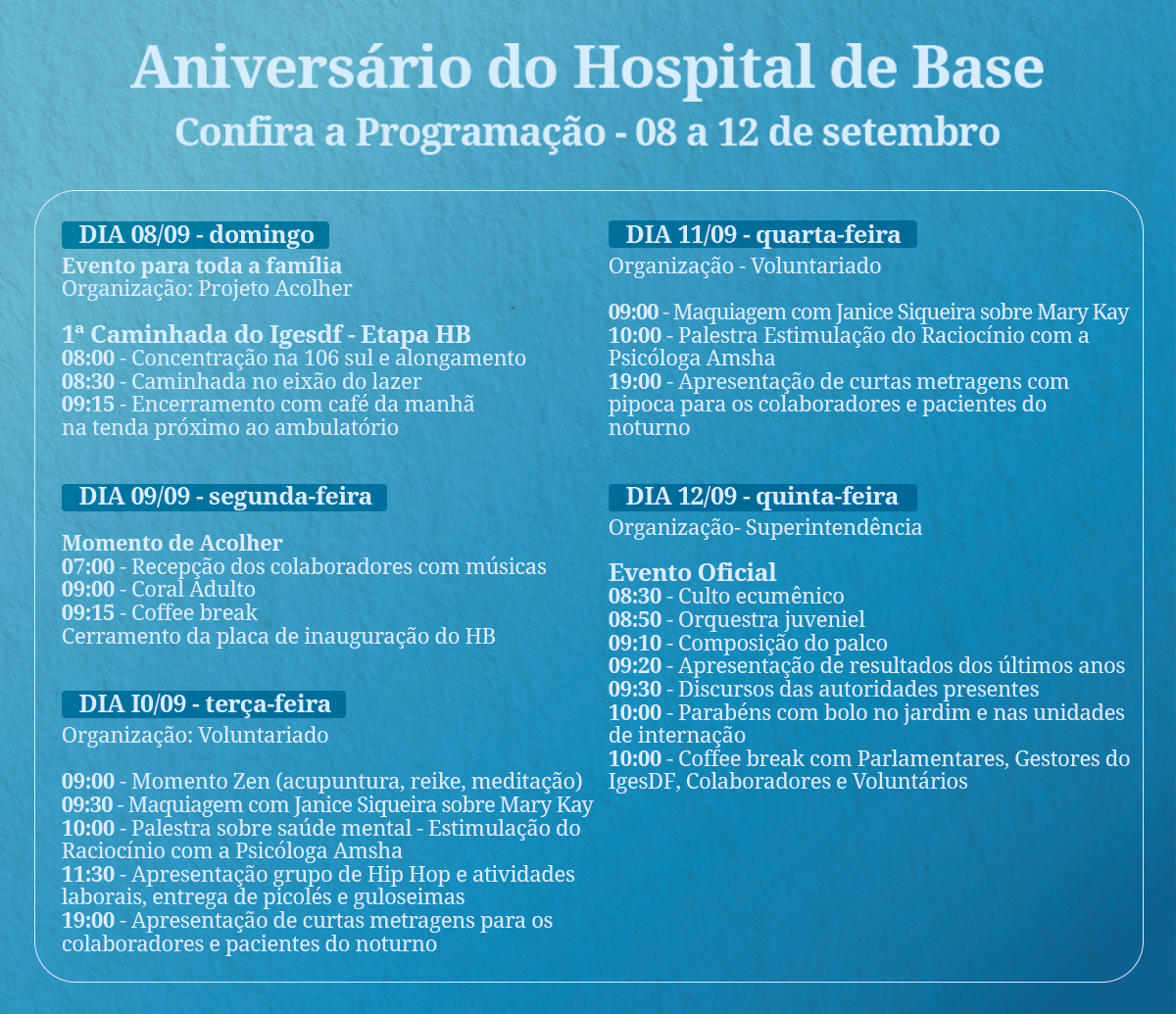 E no dia 12 de setembro, data de aniversário do HBDF, as atividades especiais serão intensas. O início está programado para as 8h30 da manhã, com um Culto Ecumênico, seguido da apresentação de uma Orquestra Juvenil.