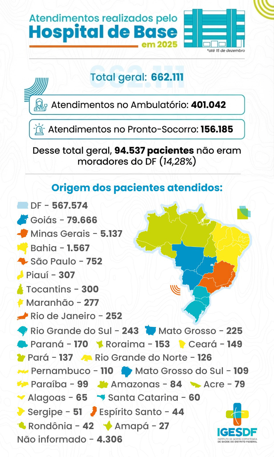 O Hospital de Base do Distrito Federal (HBDF) realizou 94.945 atendimentos a pacientes residentes fora da capital federal entre janeiro e 15 de dezembro de 2025. O volume representa 14,28% do total de 662.111 assistências prestadas pela unidade no período. A gestão do Instituto de Gestão Estratégica em Saúde do Distrito Federal (IgesDF) indica que o fluxo consolida o hospital como polo de referência nacional em especialidades complexas.