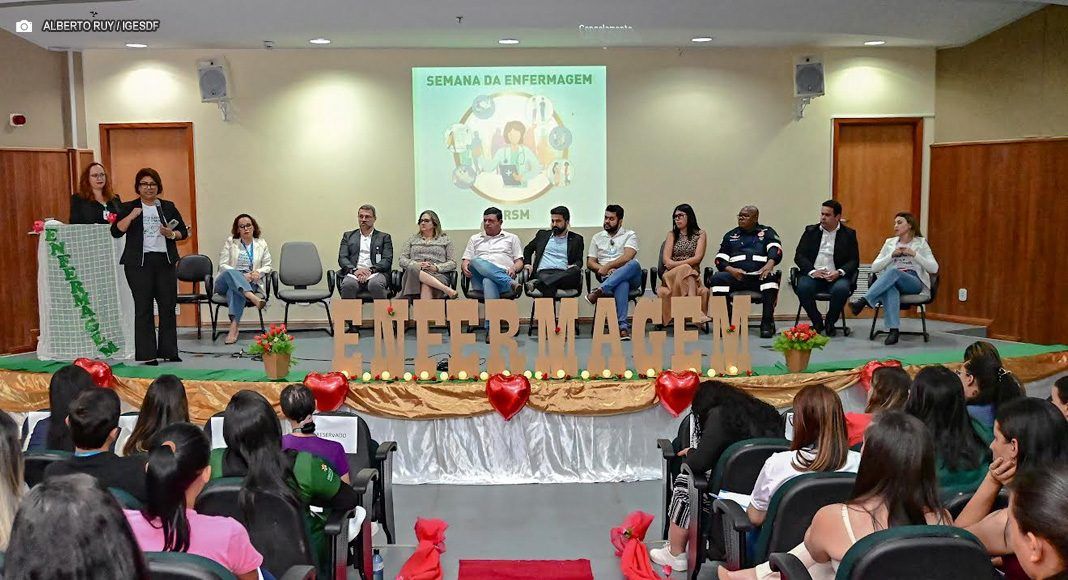 Após a mesa de abertura, os gestores do HRSM prestaram uma homenagem simbólica aos enfermeiros e técnicos de enfermagem. Diversos profissionais foram convidados ao palco para receber certificados de reconhecimento, enquanto um vídeo celebrava o trabalho das equipes.