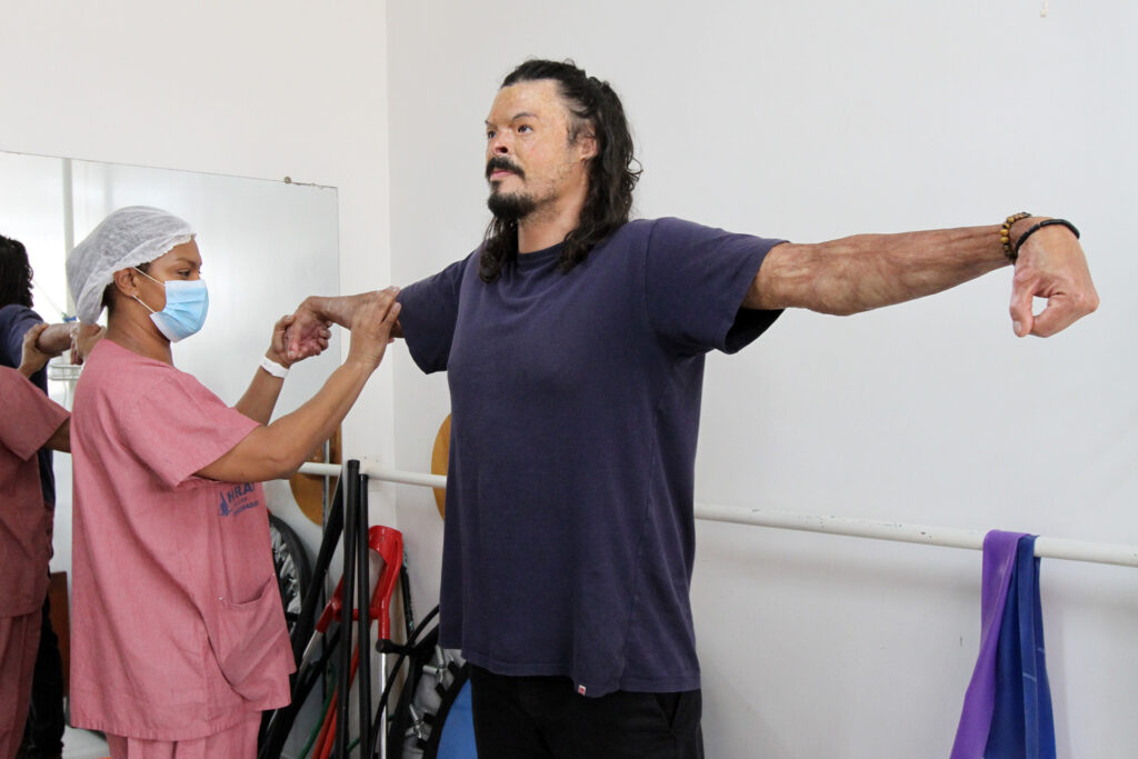 “Se eu tenho mobilidade hoje, é por causa da fisioterapia; elas [profissionais de saúde] pegam pesado, mas é pensando na minha recuperação. Eu quase não movimentava o meu joelho, e agora mexo 100%. Me sinto muito feliz, nunca pensei que ia voltar a andar”, destaca Ricardo acerca do trabalho realizado pela equipe do Núcleo de Saúde Funcional (NSF) do hospital. Em parceria com a Unidade de Queimados, o setor consegue oferecer cuidado integral ao paciente.