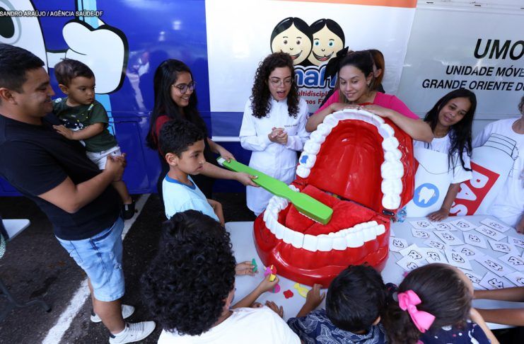 Em comemoração ao Dia Mundial da Saúde Bucal, celebrado na próxima quinta-feira (20), o Serviço Multidisciplinar de Atendimento aos Fissurados do Hospital Regional da Asa Norte (Smafis/Hran) organizou, nesta semana (17), um evento educativo a pacientes pediátricos, pais e responsáveis. Fora do prédio, no estacionamento da unidade, uma escova de dente se juntava à pasta e ao fio dental contra uma cárie, divertindo e ensinando ao mesmo tempo.