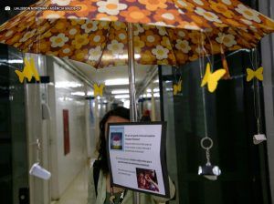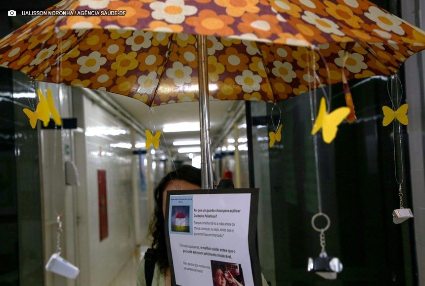 Realizada de forma itinerante nas enfermarias, com abordagens individuais e coletivas, as intervenções contaram com auxílio de dois guarda-chuvas, símbolo dos cuidados paliativos. “O cuidado paliativo é representado pelo guarda-chuva. Embora possa parecer precoce oferecer cuidados paliativos, o curso da doença pode ser como a chuva, difícil de prever. Diante do tratamento curativo, é possível usar o guarda-chuva num momento de sofrimento, serviço que é justamente oferecido pela equipe especializada”, completou a nutricionista.