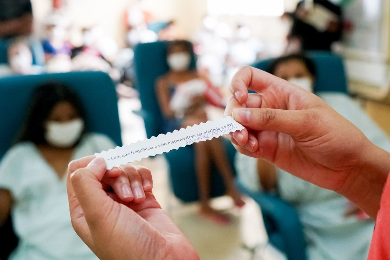 Com dinâmicas e orientações, a equipe multidisciplinar – formada por fonoaudióloga, terapeuta ocupacional e enfermeira – tirou dúvidas e orientou gestantes e puérperas sobre amamentação, dificuldades dos primeiros dias após o nascimento do bebê e importância do aleitamento materno exclusivo até os seis meses de vida. Também foram feitas demonstrações sobre a forma correta de amamentar.