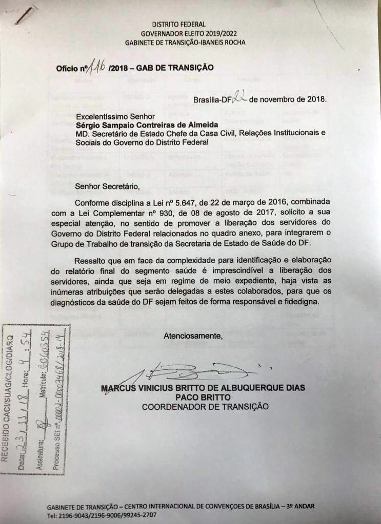Alto escalão da saúde à parte, o chefe da Casa Civil do DF, Sérgio Sampaio, deve publicar, no Diário Oficial do DF (DODF), a qualquer momento, os nomes de servidores da SES-DF e de outros órgãos do GDF, que devem ficar a disposição para municiar o novo governo, das informações sobre a Saúde do DF. A relação foi apresentada à Sampaio, pelo vice-governador eleito, Paco Britto.