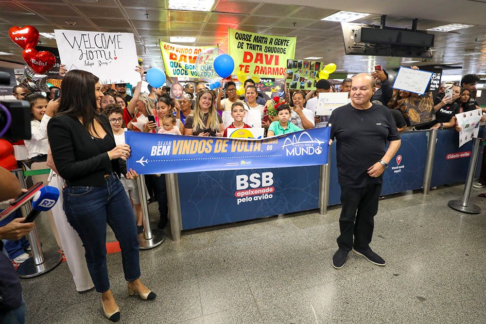 O governador Ibaneis Rocha e a primeira-dama Mayara Noronha Rocha recepcionaram, nesta sexta-feira (05/Dez), o último grupo de estudantes da rede pública que participou do programa Pontes para o Mundo. O desembarque de 27 alunos e dois servidores no Aeroporto Internacional de Brasília marcou o encerramento da primeira edição da iniciativa, que enviou ao todo 101 jovens para um intercâmbio de 17 semanas no Reino Unido.