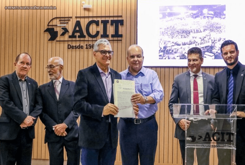 O governador Ibaneis Rocha entregou, na noite desta terça-feira (28), as três primeiras escrituras do Programa de Apoio ao Empreendimento Produtivo do Distrito Federal (Desenvolve-DF), em cerimônia na sede da Associação Comercial e Industrial de Taguatinga (Acit).
