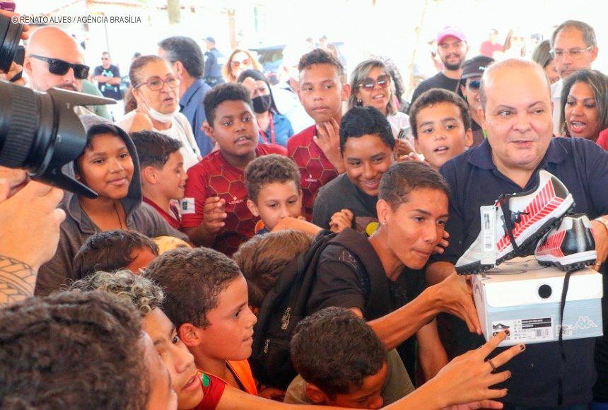 Depois, foi a vez da inauguração do campo de grama sintética localizado na Quadra 13, do Setor Sul do Gama. No local, as crianças de um programa social receberam chuteiras e uniformes, além do espaço completamente reformado.