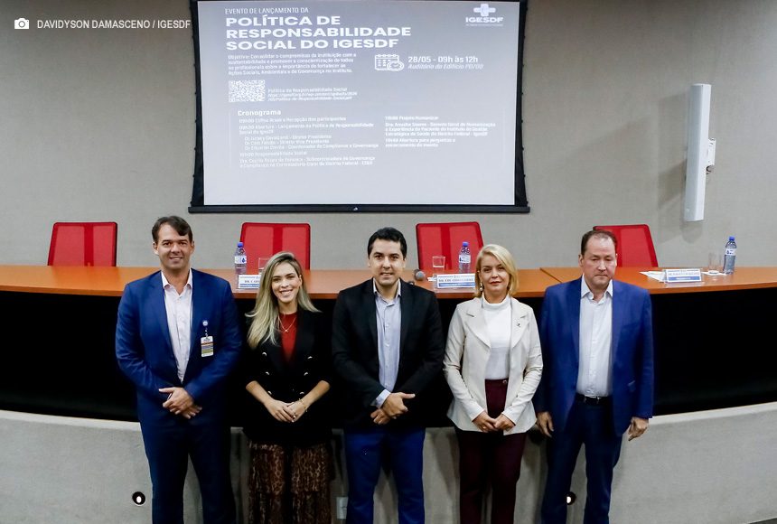 O Instituto de Gestão Estratégica de Saúde do Distrito Federal (IgesDF) realizou nesta terça-feira (28) o lançamento de sua Política de Responsabilidade Social. Abriram o evento o Diretor-Presidente do IgesDF, Juracy Cavalcante Lacerda Jr., o Vice-presidente, Caio Valério Gondim Reginaldo Falcão, e o Coordenador de Compliance e Governança, Eduardo Luiz Corrêa.