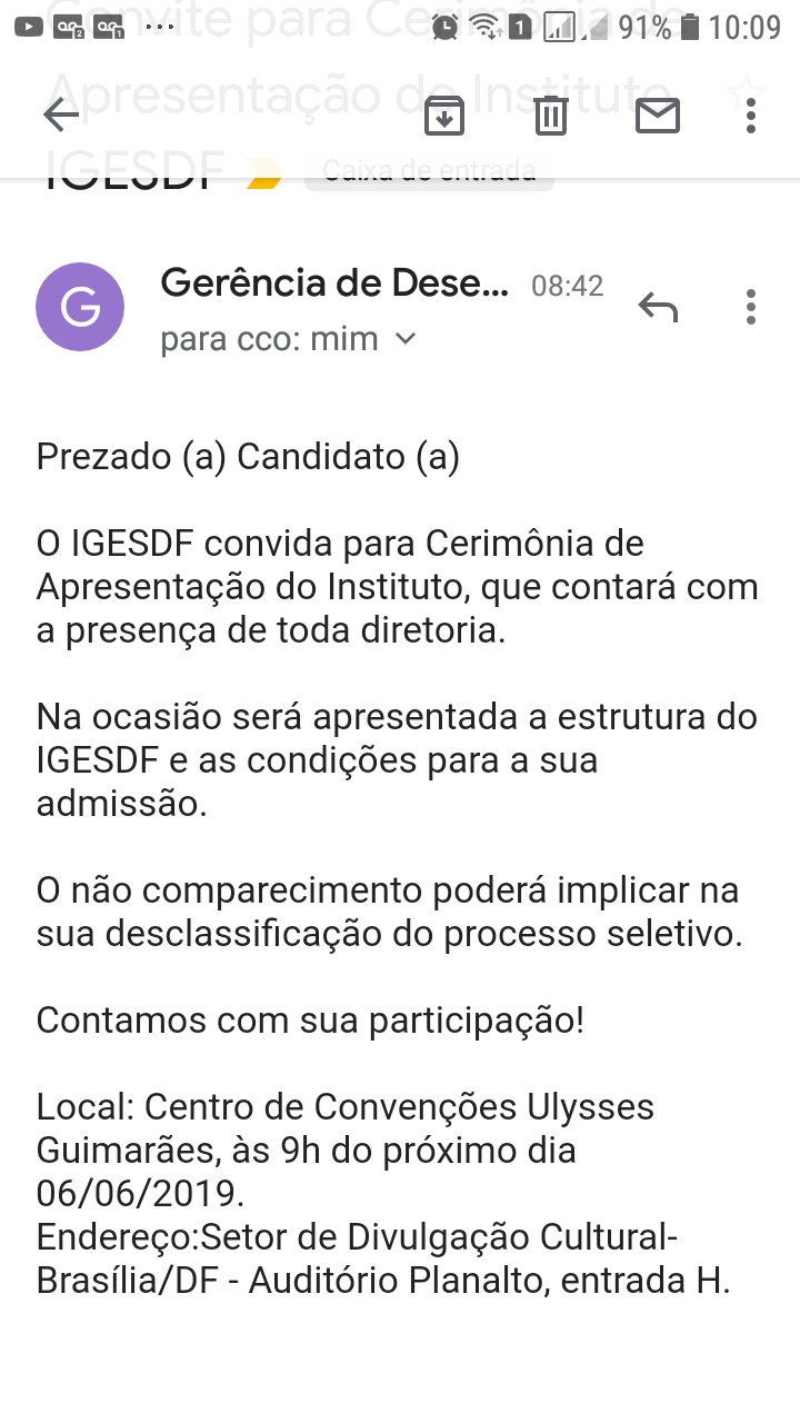 “Essa é uma convocação aos profissionais que estão participando do processo seletivo, que serão recepcionados por toda diretoria do Instituto, onde devem receber informações sobre o IGESDF, além de apresentar as documentações.”.