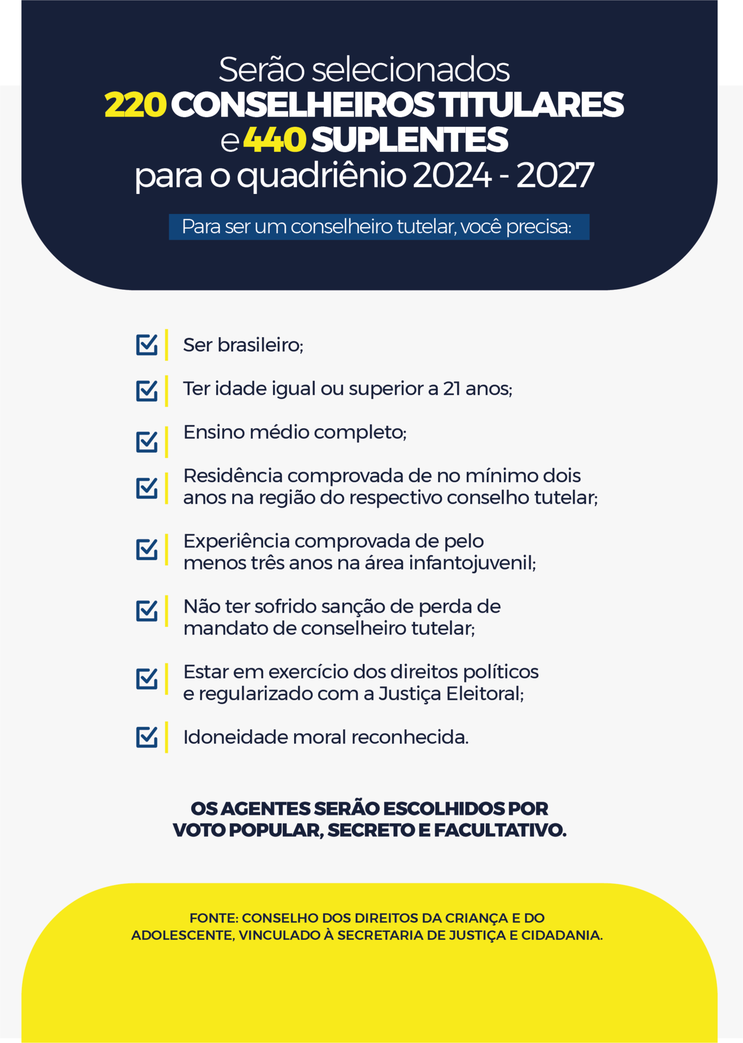 Serão escolhidos 220 conselheiros tutelares titulares e outros 440 suplentes para mandato no quadriênio 2024-2027, atendendo as 35 regiões administrativas do Distrito Federal. A eleição ocorrerá em 1º de outubro.