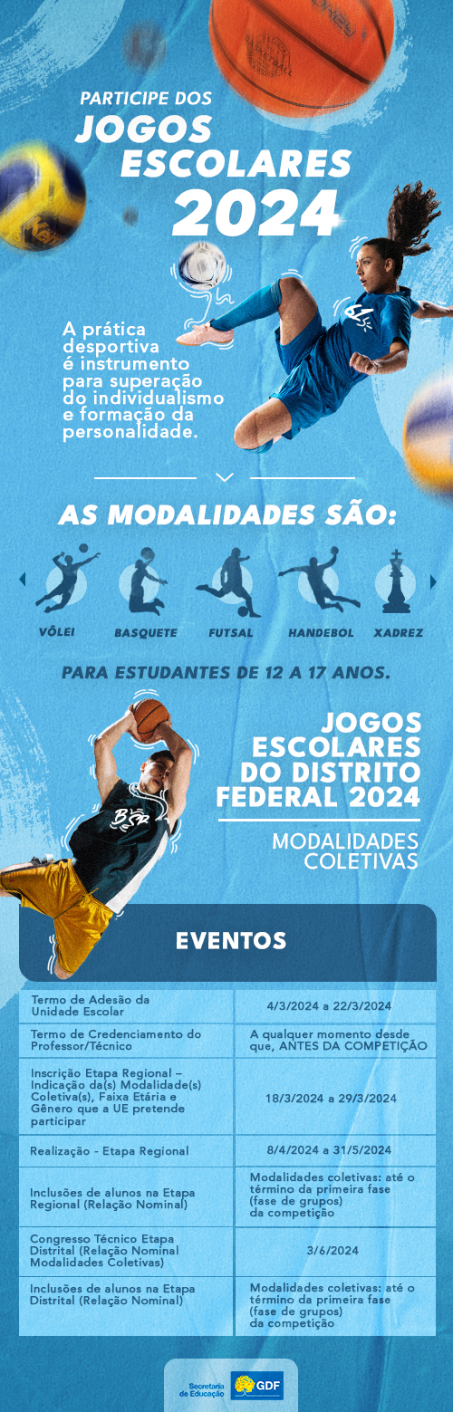 Vai começar a maior competição esportiva para estudantes de 12 a 17 anos de escolas públicas e particulares do Distrito Federal. A 64ª edição anual dos Jogos Escolares do DF (JEDF) visa promover a prática esportiva entre os alunos e identificar os futuros destaques do cenário esportivo da capital.