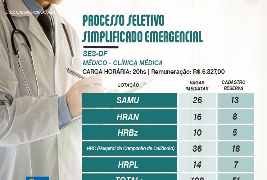 As inscrições para contratação imediata de 102 médicos temporários via Processo Seletivo Simplificado Emergencial terminam na próxima terça-feira (22). Os aprovados irão trabalhar nos hospitais regionais da Asa Norte, Brazlândia e Planaltina, além do Serviço de Atendimento Móvel de Urgência (Samu) e do Hospital de Campanha de Ceilândia. Os médicos que atuarão na última unidade mencionada serão lotados no HRC.