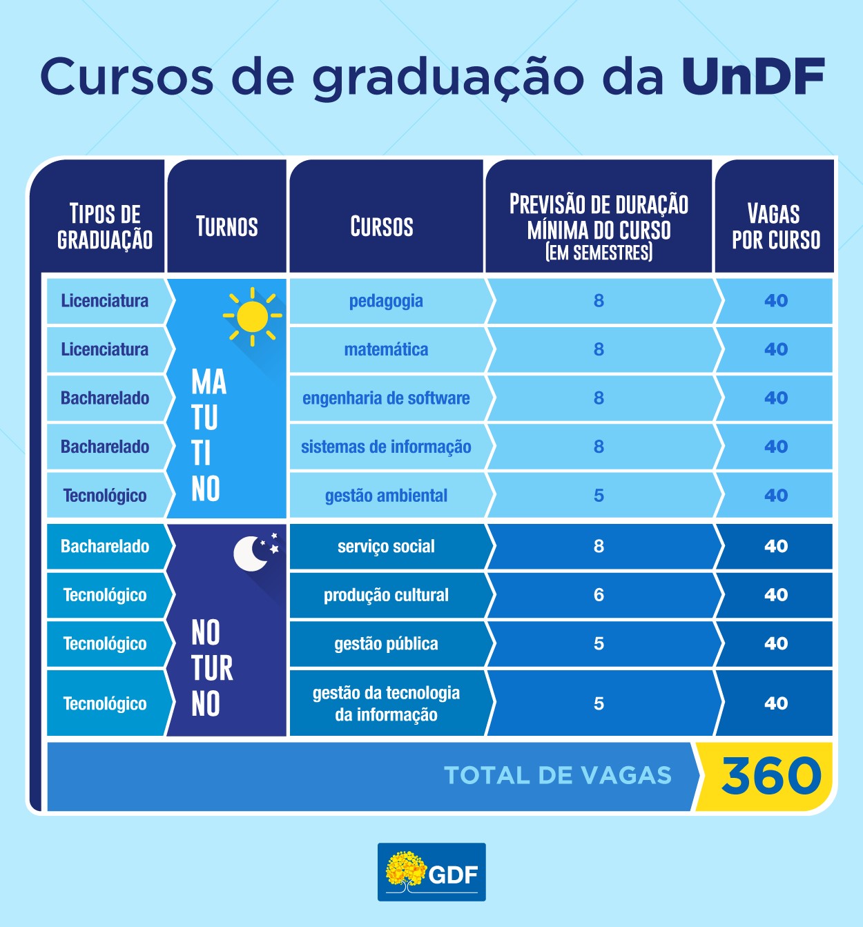 No dia 28, a UnDF vai divulgar a lista de homologados e as notas. O prazo para recursos vai do dia seguinte (29) a 4 de julho. Em 11 de julho, a universidade publicará a classificação final do processo seletivo, enquanto o período de matrícula dos aprovados está previsto para 17 a 21 de julho. As aulas começam no segundo semestre, no campus Norte, localizado no CA 2 do Lago Norte.