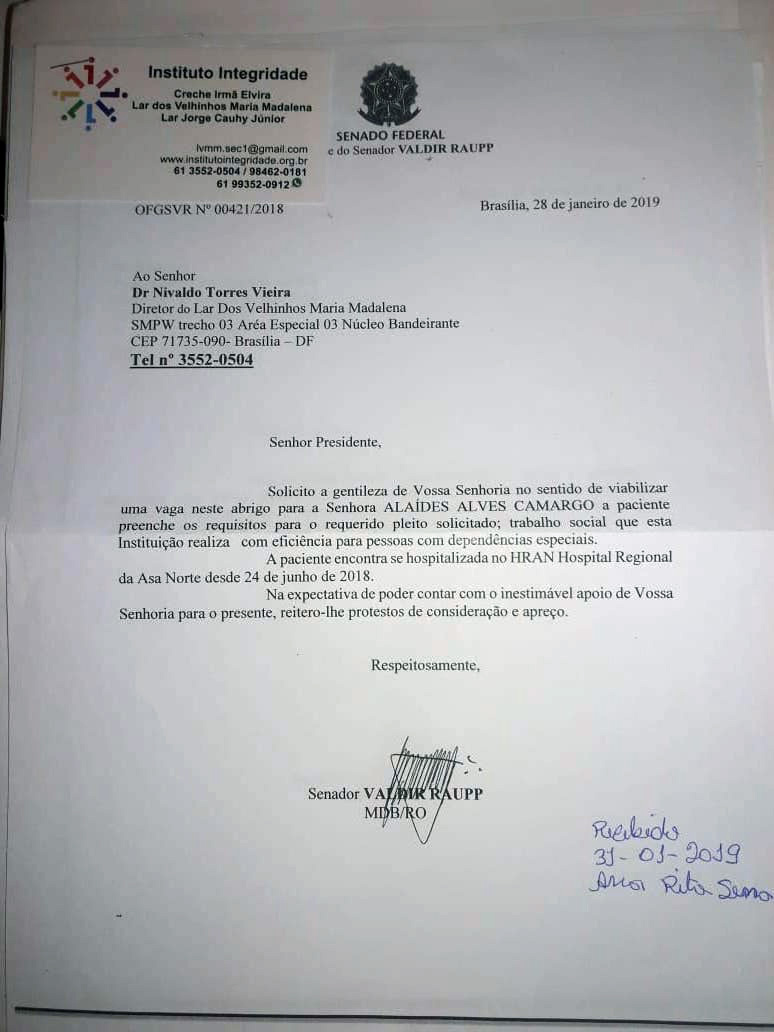 O profissional de saúde encaminhou ao PD, um ofício em que Raupp tentou conseguir a transferência da idosa para um lar de idosos.  Por meio de ofício, o parlamentar chegou a encaminhar um ofício ao Lar dos Velhinhos Maria Madalena. Nelo o senador pediu a providência de uma vaga à idosa. Porém, oito meses após o envio do pedido, dona Alaídes Alves permanece internada no HRAN.