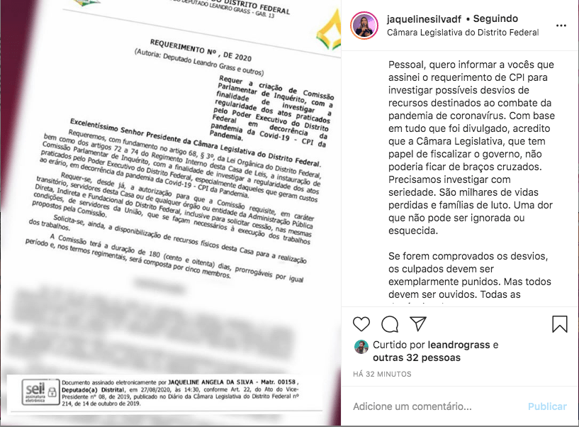 “Pessoal, quero informar a vocês que assinei o requerimento de CPI para investigar possíveis desvios de recursos destinados ao combate da pandemia de coronavírus. Com base em tudo que foi divulgado, acredito que a Câmara Legislativa, que tem papel de fiscalizar o governo, não poderia ficar de braços cruzados. Precisamos investigar com seriedade. São milhares de vidas perdidas e famílias de luto. Uma dor que não pode ser ignorada ou esquecida.”, publicou Jaqueline Silva.