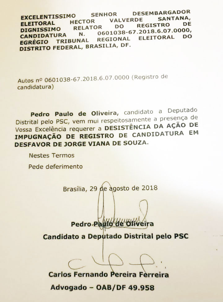 Porém, após tomar conhecimento da ação, Vianna se encontrou com Pepa que negou ter conhecimento da ação ajuizada junto ao Tribunal Regional Eleitoral do DF (TRE-DF). O colega que também disputa uma vaga para a Câmara Legislativa, explicou que a ação foi ajuizada sem conhecimento e anuência, ocasião em que assinou um pedido de desistência da ação, além de declarar apoio a candidatura do sindicalista.