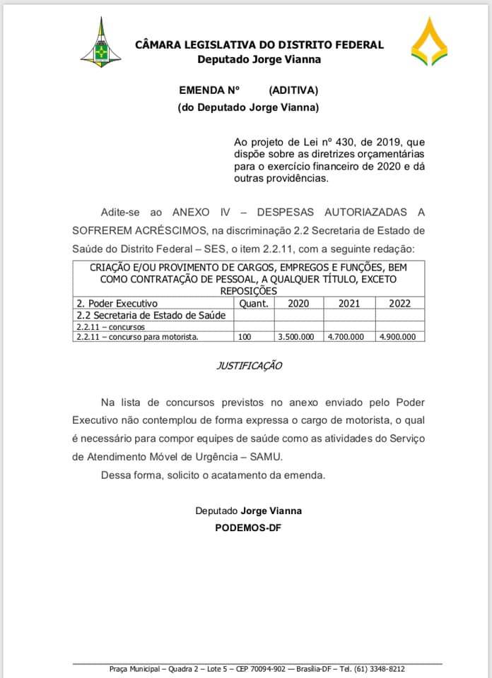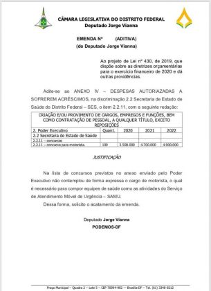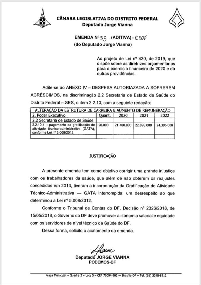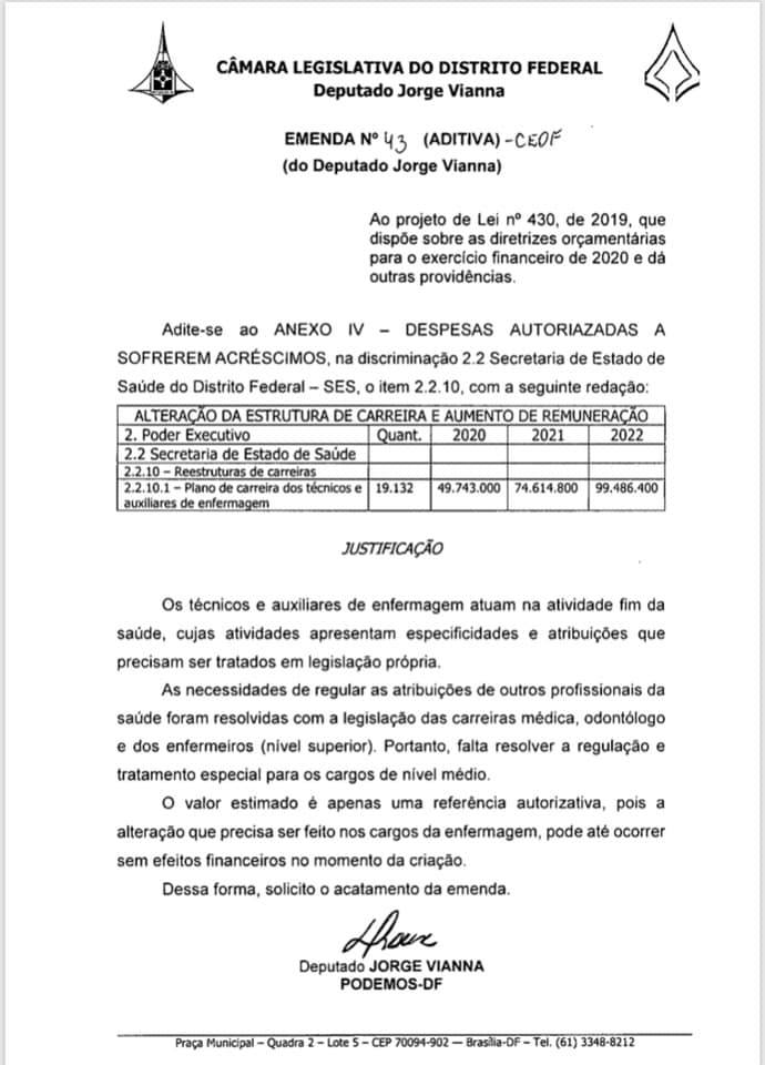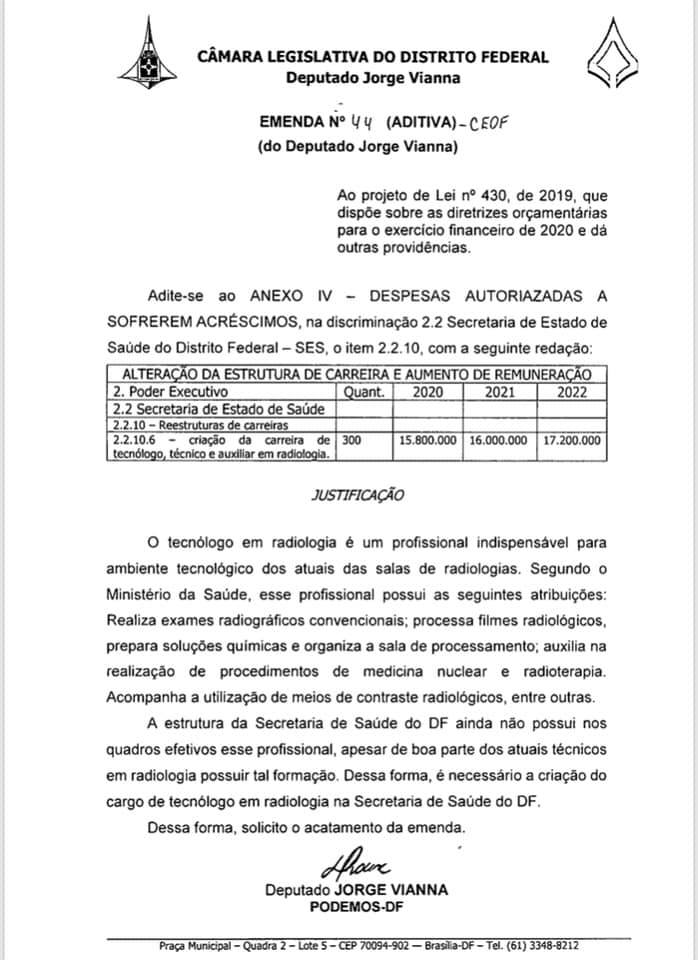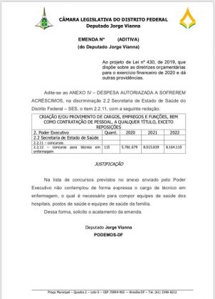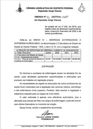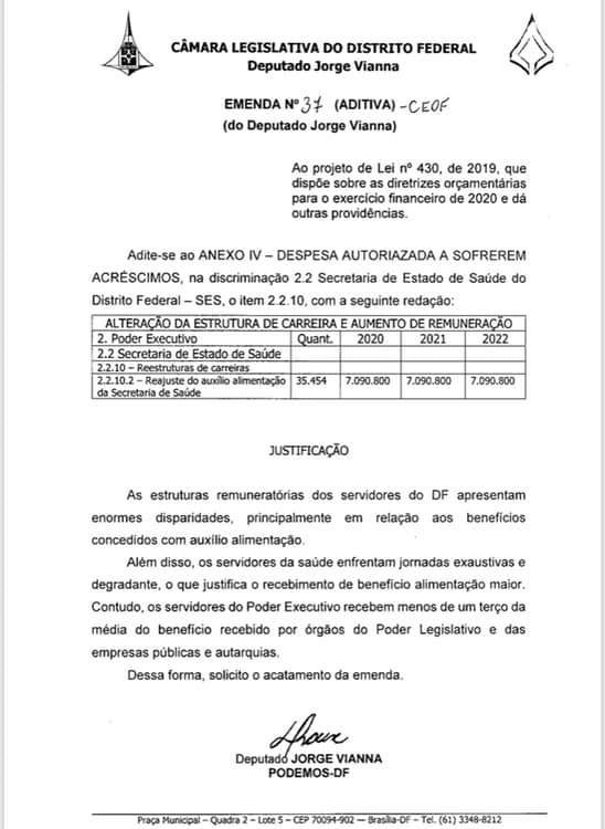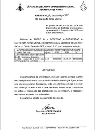 O deputado distrital, Jorge Vianna (PODEMOS), divulgou nas redes sociais, as emendas apresentadas a Lei de Diretrizes Orçamentária (LDO) para 2020. Dentre as categorias beneficiadas estão a enfermagem radiologia, odontólogos, nutricionistas, motoristas, além dos profissionais técnicos-administrativos.