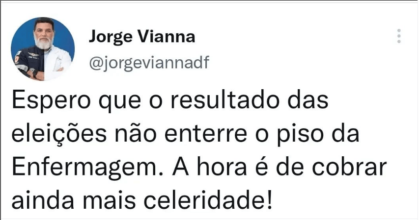 Com a consolidação das eleições de segundo turno e a eleição do ex-presidente eleito, Luis Inácio Lula da Silva (PT), para o terceiro mandato da presidência da República do Brasil, uma preocupação da Enfermagem, foi refletida pelo deputado distrital, Jorge Vianna (PSD). Nas redes sociais, o distrital postou o alerta. “Espero que o resultado das eleições não enterre o piso da enfermagem.”