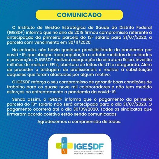 Em nota, o IGESDF aponta a impossibilidade de arcar com o compromisso assumido, em convenção coletiva, conjuntamente com as entidades sindicais, em decorrência da imprevisibilidade ocasionada pela pandemia do coronavírus. O instituto, aponta aumento de gastos com aquisições de Equipamentos de Proteção Individual e ampliação do quadro funcional para cobrir vacâncias e ampliar o quadro de recursos humanos.