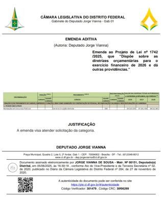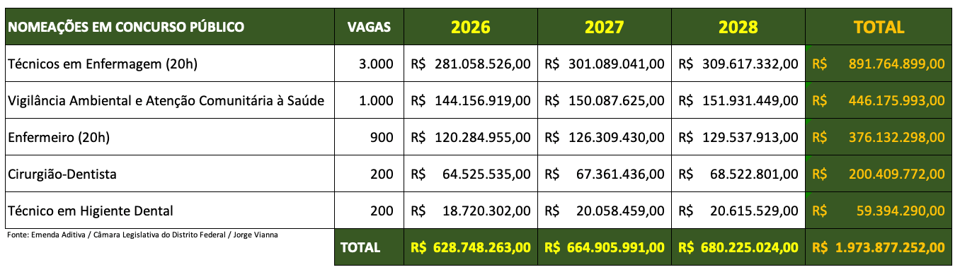O deputado distrital, Jorge Vianna (PSD), divulgou, na noite de sexta-feira (04/Jun), a destinação de R$ 1,97 bi, em emendas aditivas ao Projeto de Lei Projeto de Lei (PL) 1.742/2025, da Lei de Diretrizes Orçamentárias (LDO), para a nomeação de aprovados em concursos públicos. Do montante, R$ 628,74 mi para o exercício de 2026, R$ 664,91 mi para 2027 e R$ 680,23 mi para o ano seguinte.