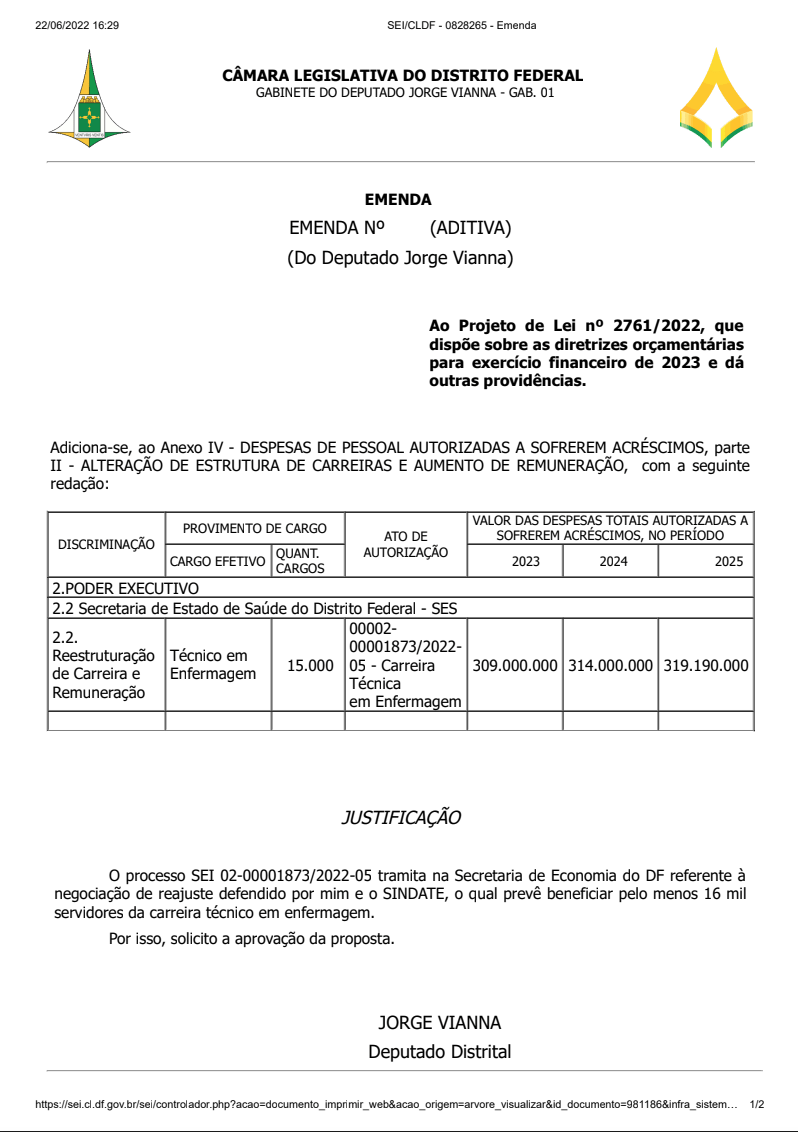 Na noite de quarta-feira (29/Jun), a Câmara Legislativa do DF (CLDF) aprovou o Projeto de Lei Projeto de Lei (PL) 2.761/2022, que dispõe sobre a Lei de Diretrizes Orçamentárias (LDO), para o exercício financeiro de 2023. Ao PL, o deputado distrital, Jorge Vianna (PSD) conseguiu aprovação de emenda aditiva em que garantiu a destinação de R$ 942,19 milhões, destinado a reestruturação da carreira e reajustes dos Técnicos em Enfermagem.