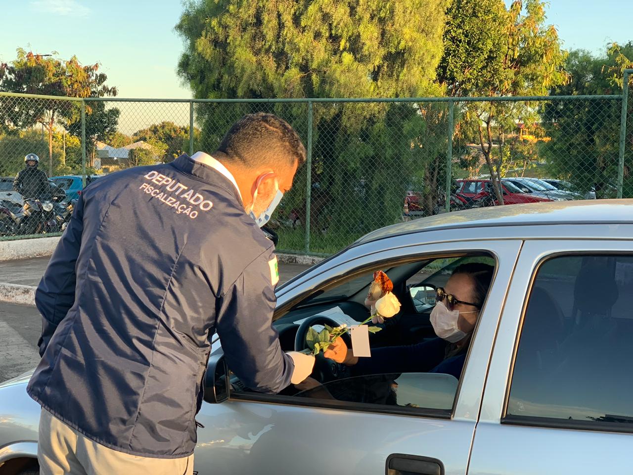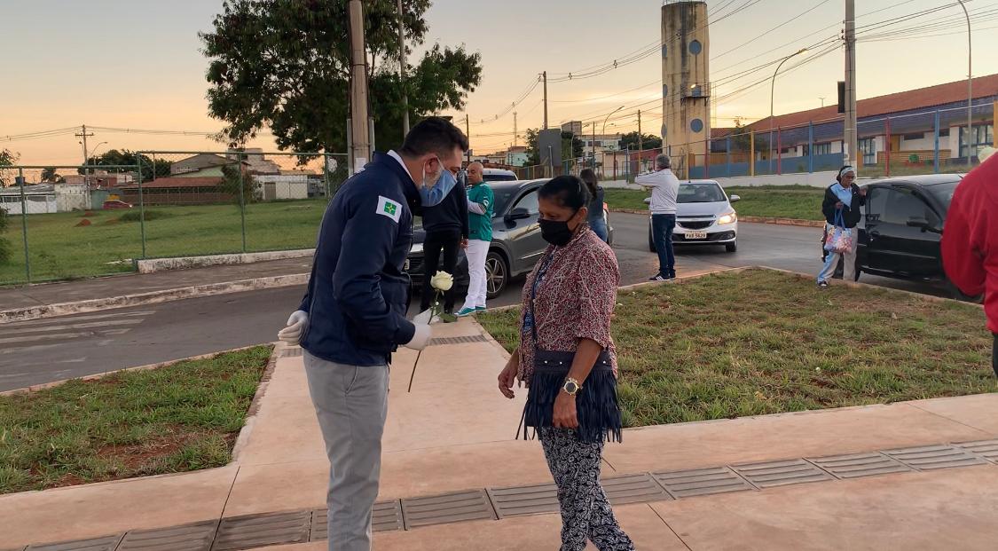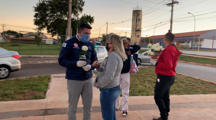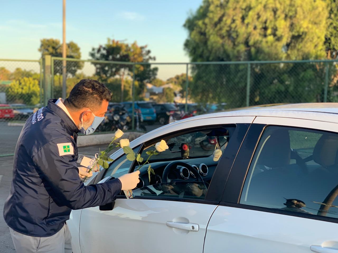 Em decorrência da pandemia do coronavírus (Covid-19), as equipes responsáveis por atuar na distribuição das flores, aos profissionais de enfermagem, fazem uso de Equipamentos de Proteção Individual (EPI), com máscaras e luvas.