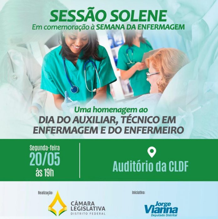 O deputado distrital, Jorge Vianna (Podemos), convida os profissionais de enfermagem para a sessão solene para comemorar a Semana da Enfermagem, a ser realizada, na noite de 20 de maio, às 19 horas, a no auditório da Câmara Legislativa do DF (CLDF). Na ocasião, o parlamentar deve homenagear os auxiliares e técnicos em enfermagem e os enfermeiros do Distrito Federal.