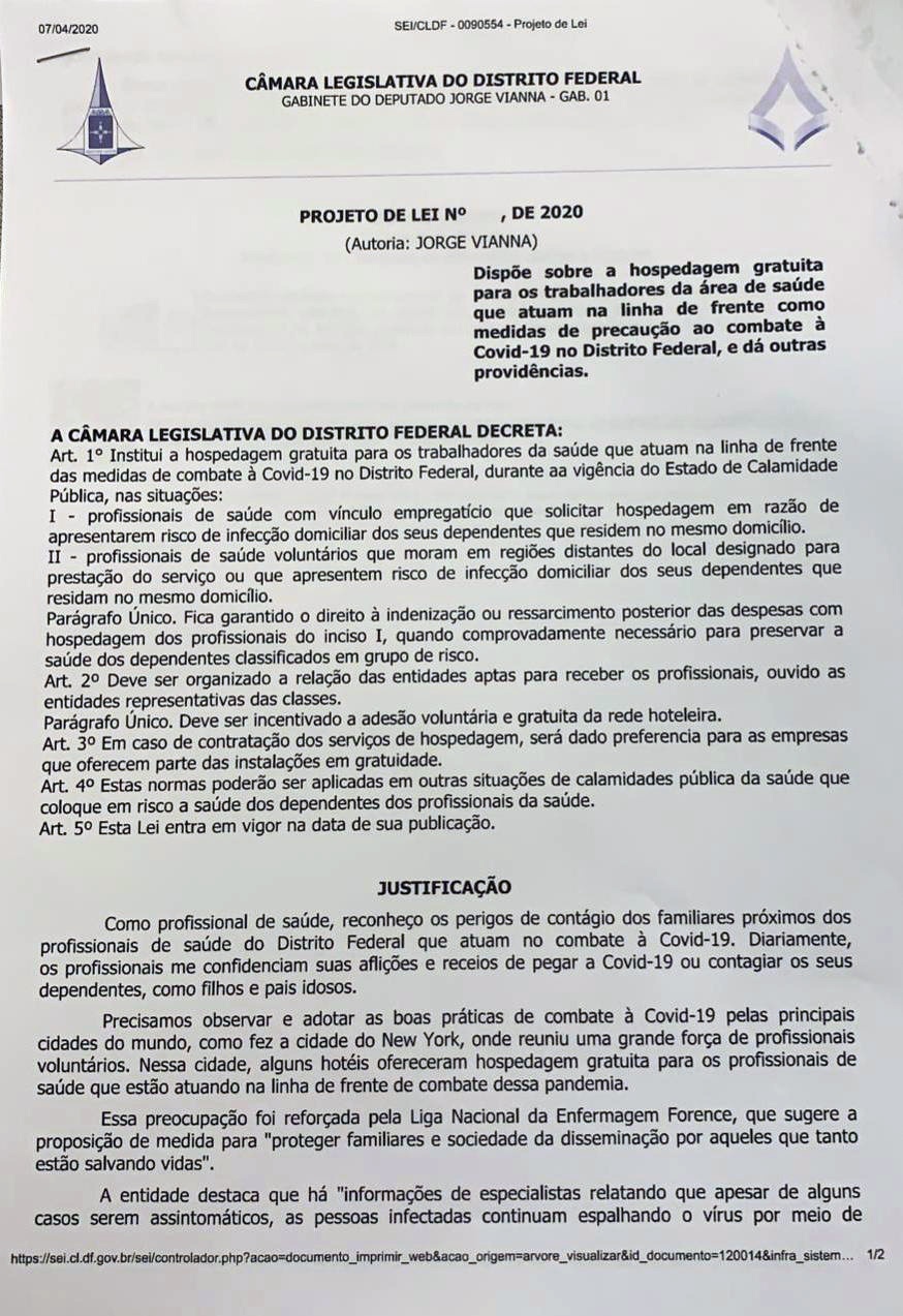 O deputado distrital, Jorge Vianna (Podemos), protocolou na terça-feira (7/Abr), Projeto de Lei que dispõe sobre a hospedagem gratuita para trabalhadores da área de saúde que atuam na linha de frente como medidas de precaução ao combate a Covid-19 no DF. Para o deputado, iniciativa deve colaborar para impedir a disseminação do vírus, entre os familiares dos profissionais de saúde.