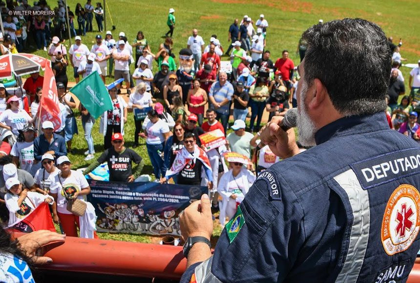 Durante o ato, próximo ao Congresso, o deputado, criticou a postura por parte dos prefeitos, e sugeriu que menos cabides de empregos resultaria em recursos para custear o reajuste da Enfermagem.