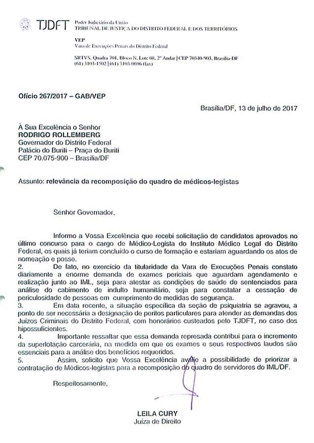 A juíza Leila Cury, da Vara de Execuções Penais do Distrito Federal, encaminhou nesta quinta-feira (13) um ofício ao governador do DF, Rodrigo Rollemberg, em que alerta sobre o baixo efetivo de médicos legistas. De acordo a juíza, há uma enorme demanda represada de exames periciais que aguardam agendamento junto ao Instituto Médico Legal (IML), o que contribui para a superlotação carcerária que o DF enfrenta atualmente e obriga a Justiça a contratar peritos particulares, gerando novos custos.
