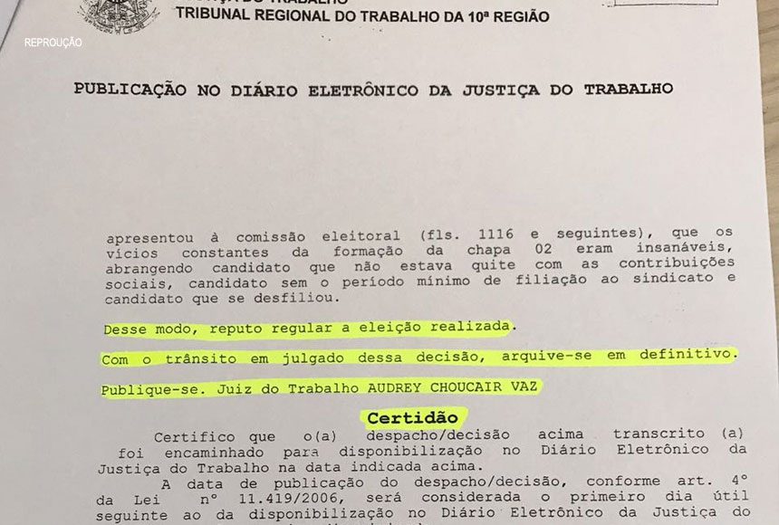 Cumprindo todos as regras e prazos eleitorais, com vistas e orientações da justiça eleitoral, por fim, a Juíza do trabalho julgou, certificou e arquivou o processo, dando vitória à chapa 1, sem nenhuma ressalva. Veja aqui a Decisao da Justica do Trabalho.