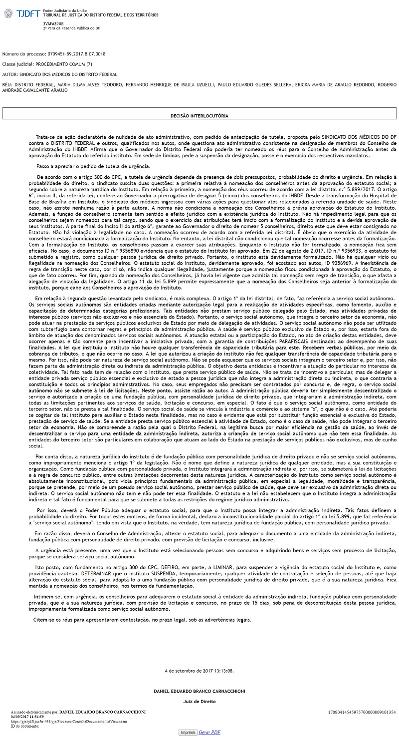 Uma decisão, em caráter liminar, à ação ajuizada pelo Sindicato dos Médicos do DF (SINDMÉDICO-DF), o Tribunal de Justiça do DF e Territórios (TJDFT) declarou inconstitucional o artigo 1º da lei 5.899/2017, que instituiu o Instituto Hospital de Base do DF (IHBDF)(4/Ago). O juiz da 2ª Vara da Fazenda Pública do DF do TJDFT, Daniel Eduardo Branco Carnacchioni também suspendeu a vigência do estatuto social, além de determinar que o GDF altere para a natureza do IHBDF para fundação pública com personalidade jurídica de direito privado.