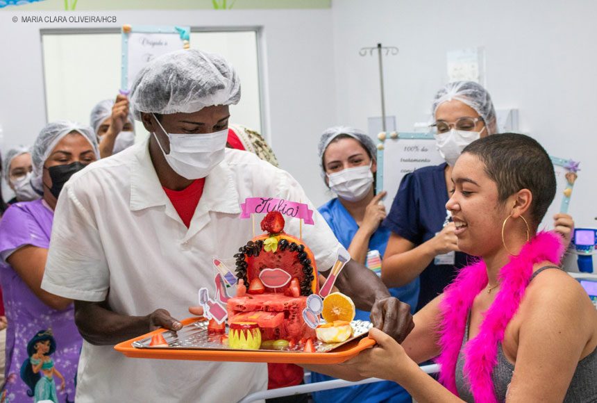 O Hospital da Criança de Brasília José Alencar (HCB) abraça os momentos marcantes da vida das crianças atendidas — como os fins de ciclos quimioterápicos e os aniversários de quem está internado. Foi o que aconteceu quando a jovem Júlia Alves, 15 anos, encerrou uma etapa de seu tratamento. Durante sessão de quimioterapia, na última sexta-feira (13), a adolescente foi surpreendida com um bolo de frutas feito especialmente para ela.