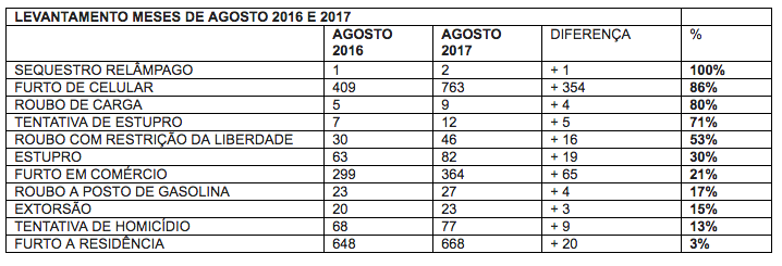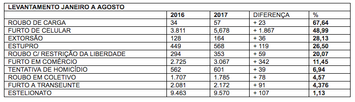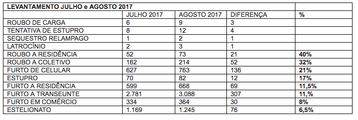 Na primeira delas, uma tabela dos crimes que tiveram maior acréscimo entre os meses de janeiro a agosto, comparando-se os anos de 2016 e 2017. A segunda tabela faz um comparativo entre os meses de agosto de 2016 e agosto de 2017. O terceiro quadro compara os meses de julho de 2017 ao mês de agosto de 2017.