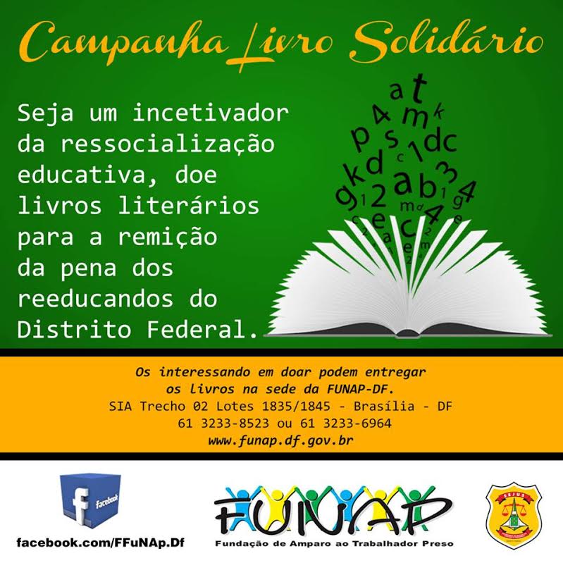 A Fundação de Amparo ao Trabalhador Preso do Distrito Federal (FUNAP/DF), vinculada à Secretaria de Justiça e Cidadania do DF (SEJUS/DF), está realizando durante o mês de Março a campanha “Livro Solidário”. O objetivo é arrecadar livros, a serem distribuídos nas penitenciárias do DF para que os detentos tenham acesso às obras e com isso podem obter remição de pena.