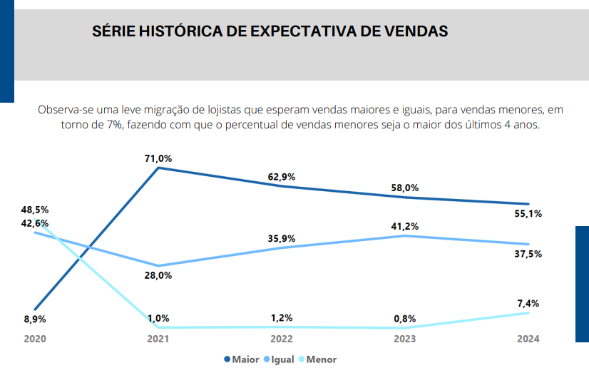 Aproximadamente 55% dos comerciantes preveem um aumento nas vendas em comparação ao ano passado, enquanto 37,5% acreditam que as vendas se manterão estáveis. Observou-se uma pequena migração entre os lojistas que previam vendas maiores ou iguais para vendas menores, resultando no índice de 7,4% dos entrevistados que preveem queda no desempenho.
