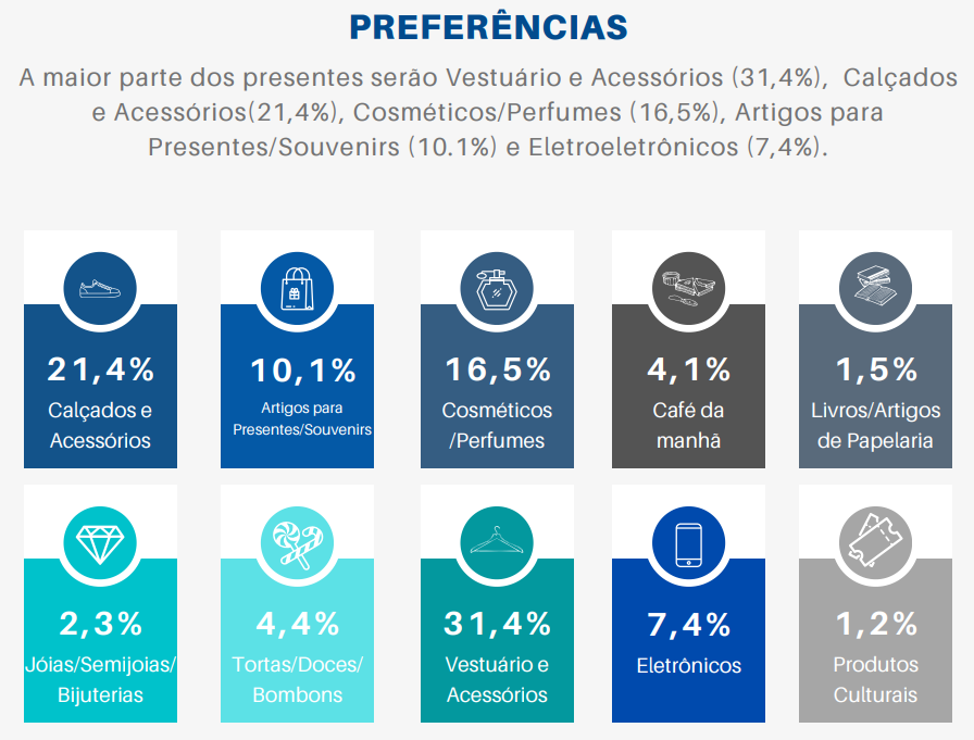 A intenção de compras entre as mulheres (76% ) é maior do que entre os homens (73,5%). No geral, a maioria planeja adquirir itens de vestuário (31,4%) e calçados (21,4%). Na sequência, vêm cosméticos ou perfumes (16,5%), artigos para presentes ou souvenirs (10.1%) e eletroeletrônicos (7,4%). As mulheres, desta vez, serão mais generosas que os homens.