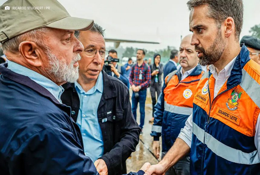 Lula e uma comitiva de ministros desembarcaram hoje em Santa Maria (RS) para reunião de trabalho com o governador do estado, Eduardo Leite, que classificou a situação como o pior desastre climático da história do Rio Grande do Sul.
