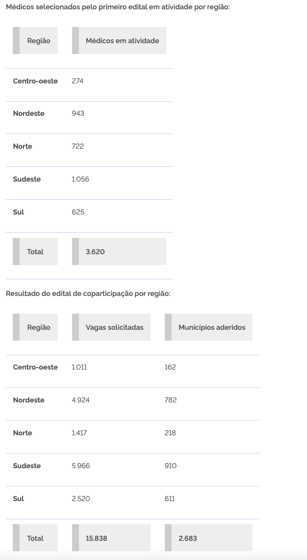 - Além desses, foi aberto um novo edital para que municípios aderidos ao Programa confirmem 1.232 vagas de reposição de profissionais.