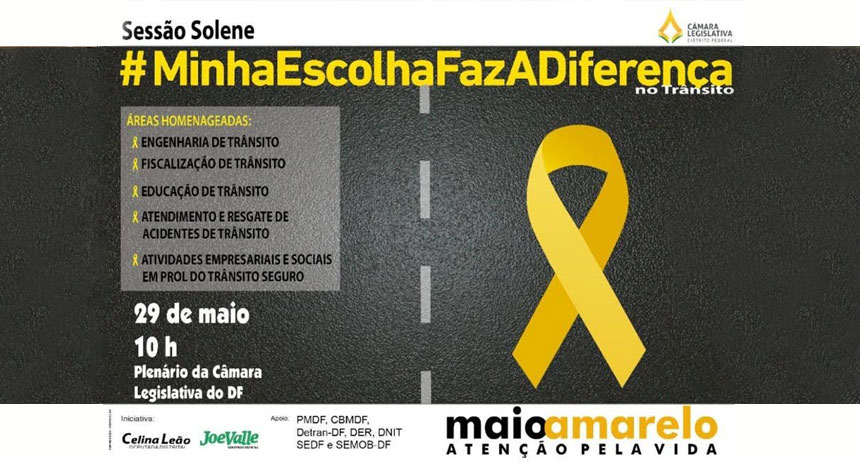“A sessão prestará homenagem aos profissionais que trabalham no trânsito em prol da prevenção, redução e atendimento de acidentes no transito do Distrito Federal”, esclarece Celina, destacando que o Maio Amarelo é um movimento internacional que visa chamar a atenção da sociedade para o alto índice de morte e feridos no trânsito de todo o mundo. “O objetivo do movimento é colocar em pauta o tema segurança viária e, mais do que chamar a atenção da sociedade sobre os altos índices de mortes, feridos e sequelados permanentes no trânsito no país e no mundo, mobilizar o seu envolvimento”.