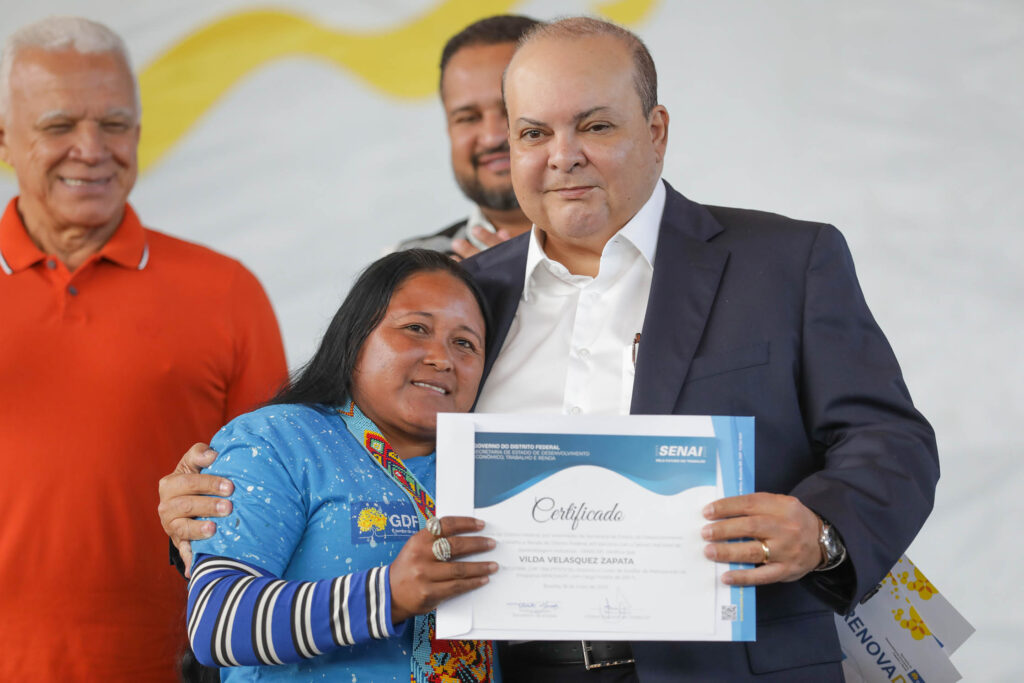 Aparecida Abadia de Sousa, 58, recebeu o diploma das mãos de Ibaneis Rocha, por ter sido aluna destaque. “Foi muito bom, aprendi muita coisa boa. Nunca pensei que na minha idade eu chegaria aonde cheguei. Mas o Renova me renovou e trouxe muitas coisas boas”, disse.