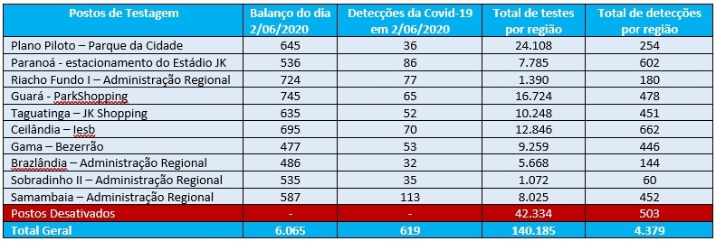 Na última terça-feira (2), o Distrito Federal alcançou a marca de 140.185 testes rápidos para a Covid-19 aplicados por meio de drive-thru. A testagem em massa é realizada no DF desde 21 de abril. Até o momento, 4.379 pessoas foram diagnosticadas com a doença causada pelo novo coronavírus (Sars-CoV-2) – aí incluídos 619 testes positivos detectados na ação de terça-feira.