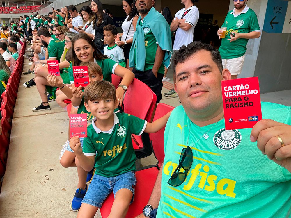 Também presente na arquibancada, o palmeirense Renan Lopes Oliveira, que veio de Goianésia (GO) acompanhado do filho para prestigiar seu time, parabenizou a ação. “Essa campanha mostra que a luta contra o racismo é de todos. Não importa o time, a cor da camisa ou da pele. Isso aqui foi um golaço da cidadania e reforça a necessidade de respeito e união”, afirmou.