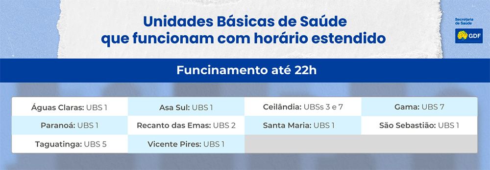 Cerca de 41% das Unidades Básicas de Saúde (UBSs) no Distrito Federal agora funcionam em horário diferenciado para garantir o acesso de cidadãos que não podem buscar atendimento durante o expediente comercial. A iniciativa da Secretaria de Saúde (SES-DF) inclui atendimentos aos sábados em 64 unidades e funcionamento noturno, até as 22h, em outras onze.