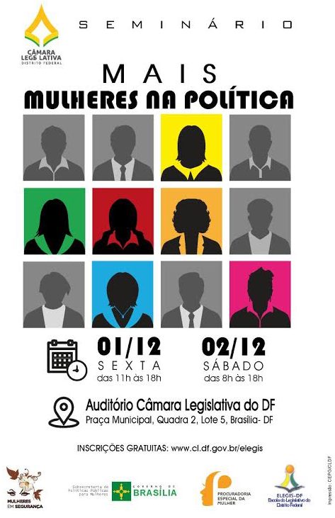 Estão abertas as inscrições para o Seminário Mais Mulheres na Política, edição 2017, com o tema “A Reconstrução do Voto”. O evento, que acontecerá nos dias 01 e 02 de dezembro, no auditório da Câmara Legislativa do Distrito Federal (CLDF), é uma iniciativa da ONG Mulheres em Segurança, liderada pela ativista Beth Moreno, em parceria com a CLDF, Secretaria de Estado do Trabalho, Desenvolvimento Social, Mulheres, Igualdade Social e Direitos Humanos, Escola do Legislativo (ELEGIS-DF) e Procuradoria Especial da Mulher da Câmara Legislativa do DF, entre outras.