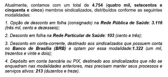 Também se questiona o total de 3.116 sindicalizados provenientes da rede pública com descontos realizados a partir da Secretaria de Estado de Saúde do DF (SES-DF), uma vez que o total de filiados consolidados em fevereiro desse ano era de 3.022 servidores representados pelo SindSaúde-DF.