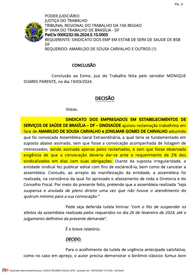 Em ação trabalhista n. 0000232-56.2024.5.10.0005, ajuizada pelo Sindicato dos Empregados em Estabelecimentos de Saúde do DF (SindSaúde-DF), a presidente, interina, Marli Rodrigues, na 9ª Vara do Trabalho do Tribunal Regional do Trabalho da 10ª Região (TRT-10) alegou que o sindicato mantinha 4.755 sindicalizados. Número esse utilizado para tentar questionar o quórum, supostamente, inferior a 2%, de profissionais de saúde presentes, necessários à convocação da Assembleia Geral Extraordinária (AGE) (26/Fev). Cerca de 100 trabalhadores deliberaram pela intervenção na gestão do SindSaúde-DF).