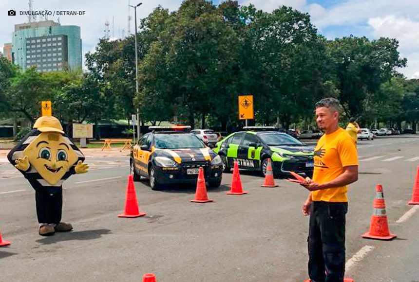Ações educativas do Detran-DF espalhadas pelo DF distribuem cartilhas e conscientizam motoristas sobre os perigos ao volante em pista molhada