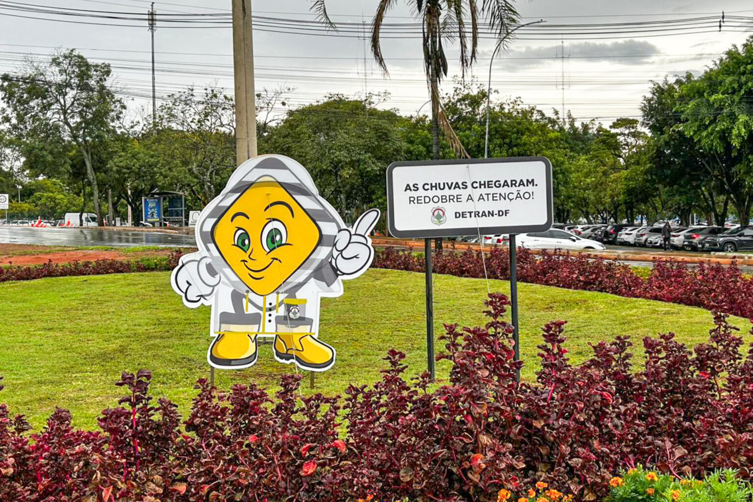 Presente nas principais cidades do DF, o mascote Segurito traz a campanha do Detran para este período de chuvas. A ideia é reforçar os cuidados com a chuva com avisos breves para o condutor que passa pela via.