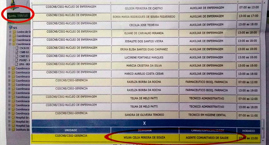Novas denúncias rondam o serviço de atendimento médico no Serviço de Pronto Atendimento (SPA) do Centro de Saúde 02 (CS2) de Núcleo Bandeirante. Desta vez Política Distrital foi procurado (19/Mai), em relação a uma suposta fraude de escala, por parte da diretora da Regional de Saúde do Núcleo Bandeirante, Park Way, Candangolândia, Riacho Fundo I e II , a pediatra, Wilna Célia Pereira de Sousa.